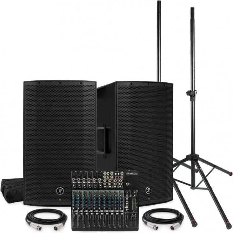 Package includes everything you need to DJ your own party. 2 speakers, 2 speaker stands, 1 analog audio mixer, 1 wired microphone, and cables to connect everything. Add optional subwoofer and wireless microphone to upgrade the system.